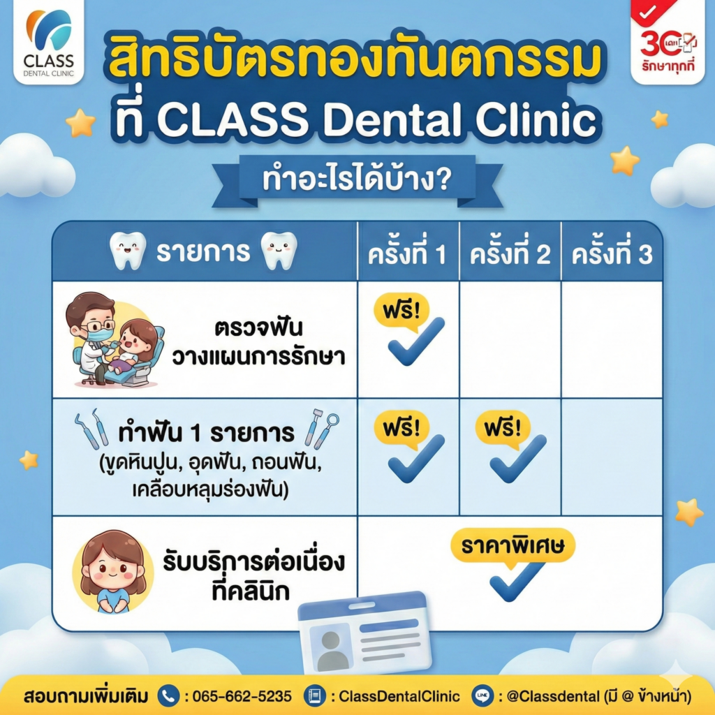 คนไทยทุกคนตั้งแต่เด็กแรกเกิด ที่ไม่ได้รับสิทธิการรักษาของข้าราชการ และไม่ได้กำลังสมทบกองทุนประกันสังคม สามารถใช้สิทธิบัตรทองทำฟันฟรีที่คลินิกเอกชนได้ 2 ครั้ง/ปี (อัปเดตปี 2569) ท่านสามารถเช็คสิทธิได้โดย คลิ๊กที่นี่