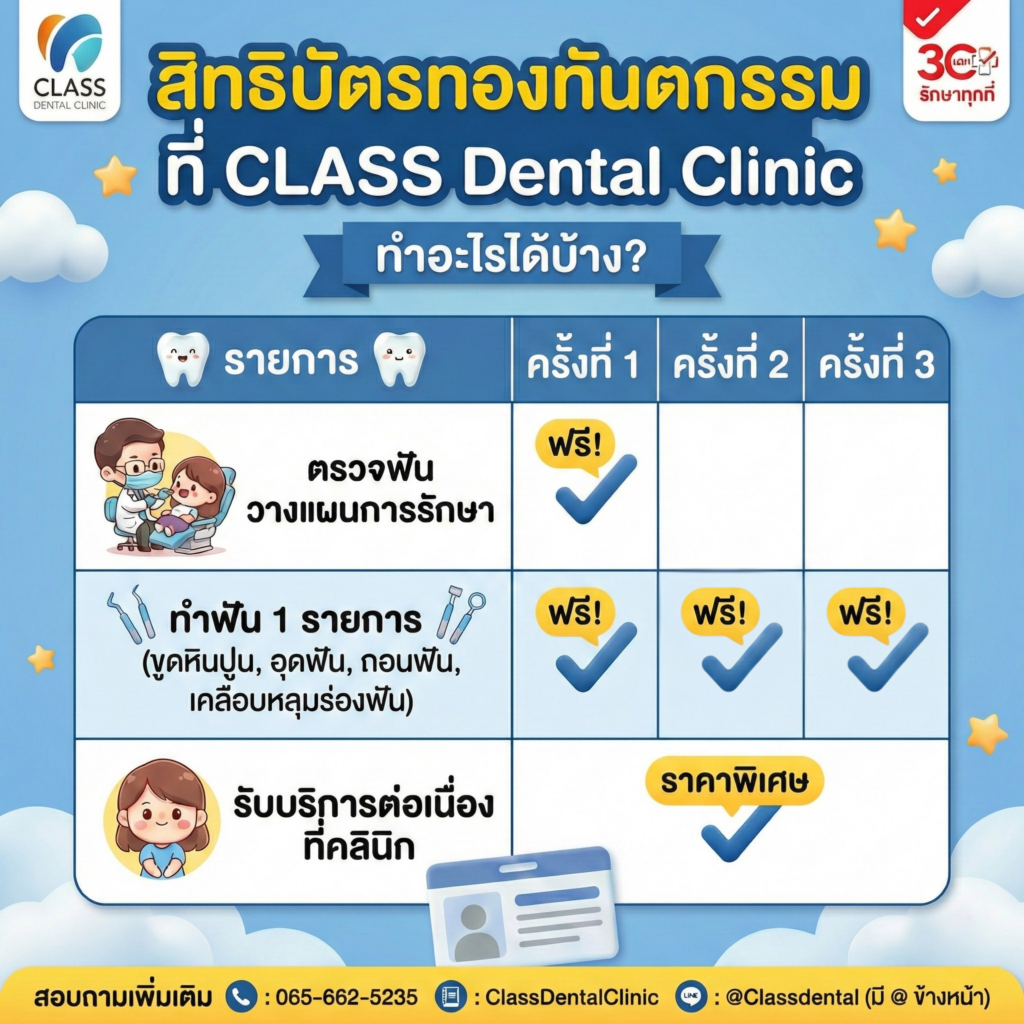 คนไทยทุกคนตั้งแต่เด็กแรกเกิด ที่ไม่ได้รับสิทธิการรักษาของข้าราชการ และไม่ได้กำลังสมทบกองทุนประกันสังคม สามารถใช้สิทธิบัตรทองทำฟันฟรีที่คลินิกเอกชนได้ 3 ครั้ง/ปี (อัปเดตเมษายน 2569) ท่านสามารถเช็คสิทธิได้โดย คลิ๊กที่นี่